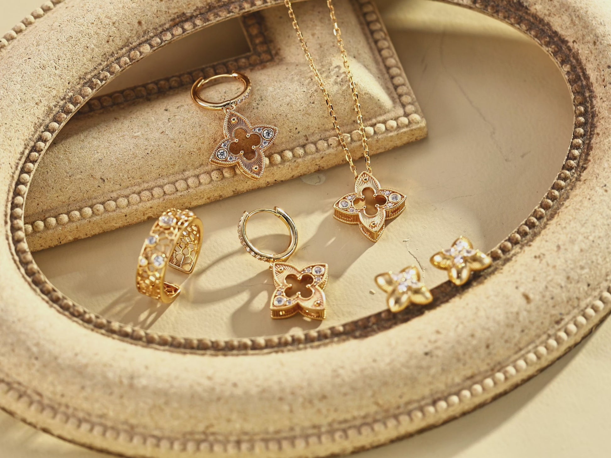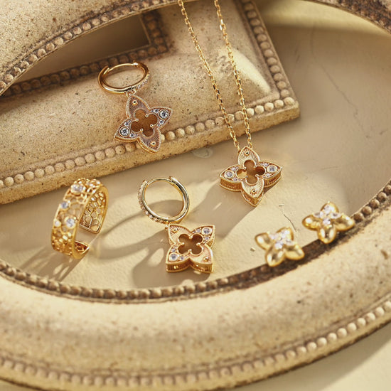 The iconic four leaf clover, symbol of luck and fortune, is reimagined with elegant striped texture and brilliant zirconia stones, creating a statement piece that combines tradition with contemporary design.