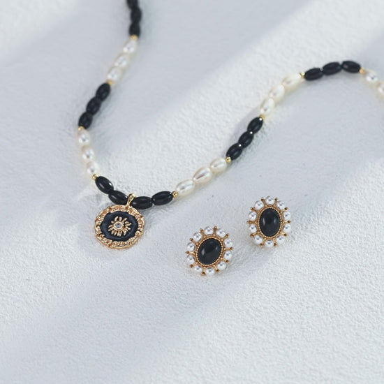 The striking contrast between deep black onyx and lustrous faux pearls creates an elegant statement piece, perfect for adding refined sophistication to any outfit.