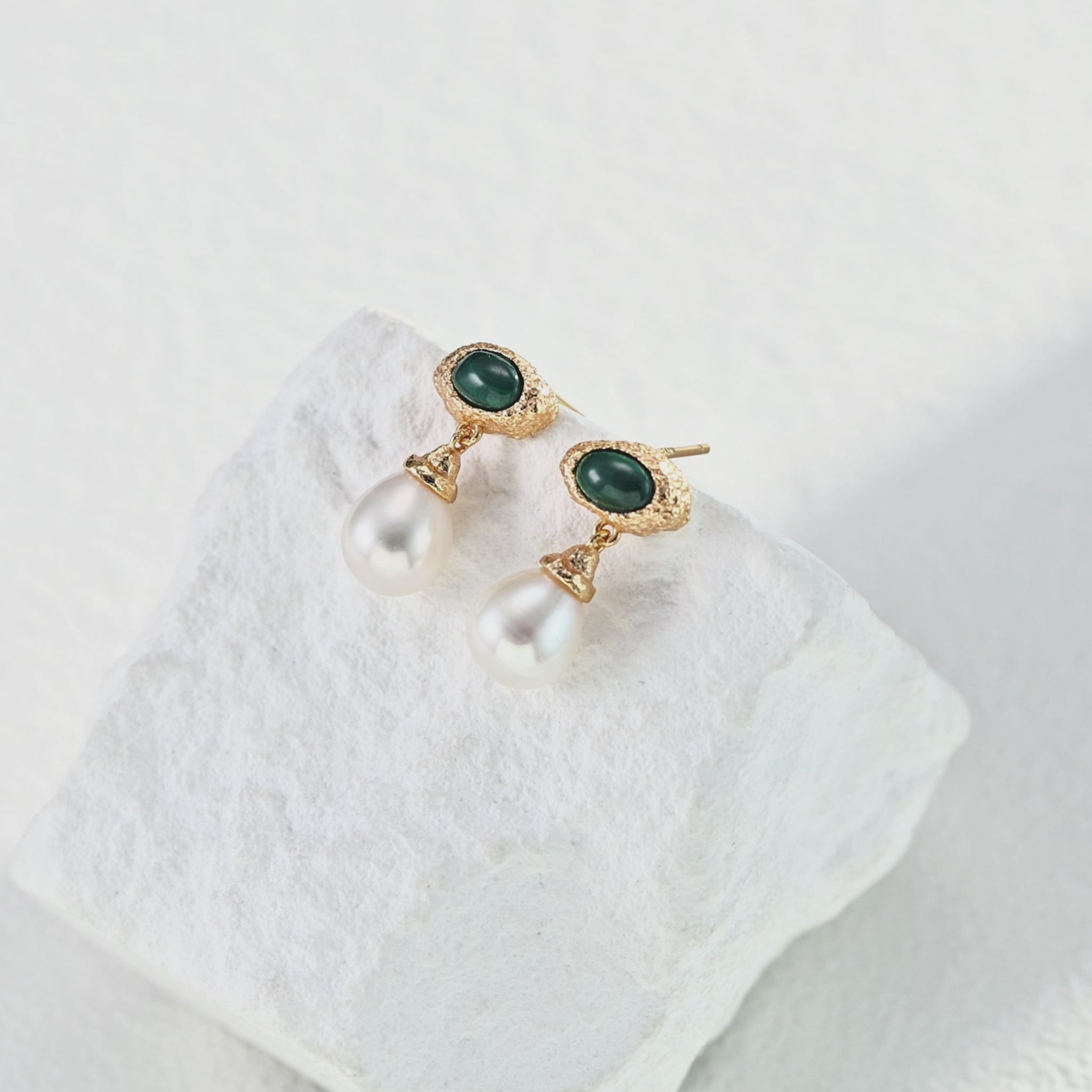 S925 Silver Natural Pearl & Malachite Earrings - Minimalist