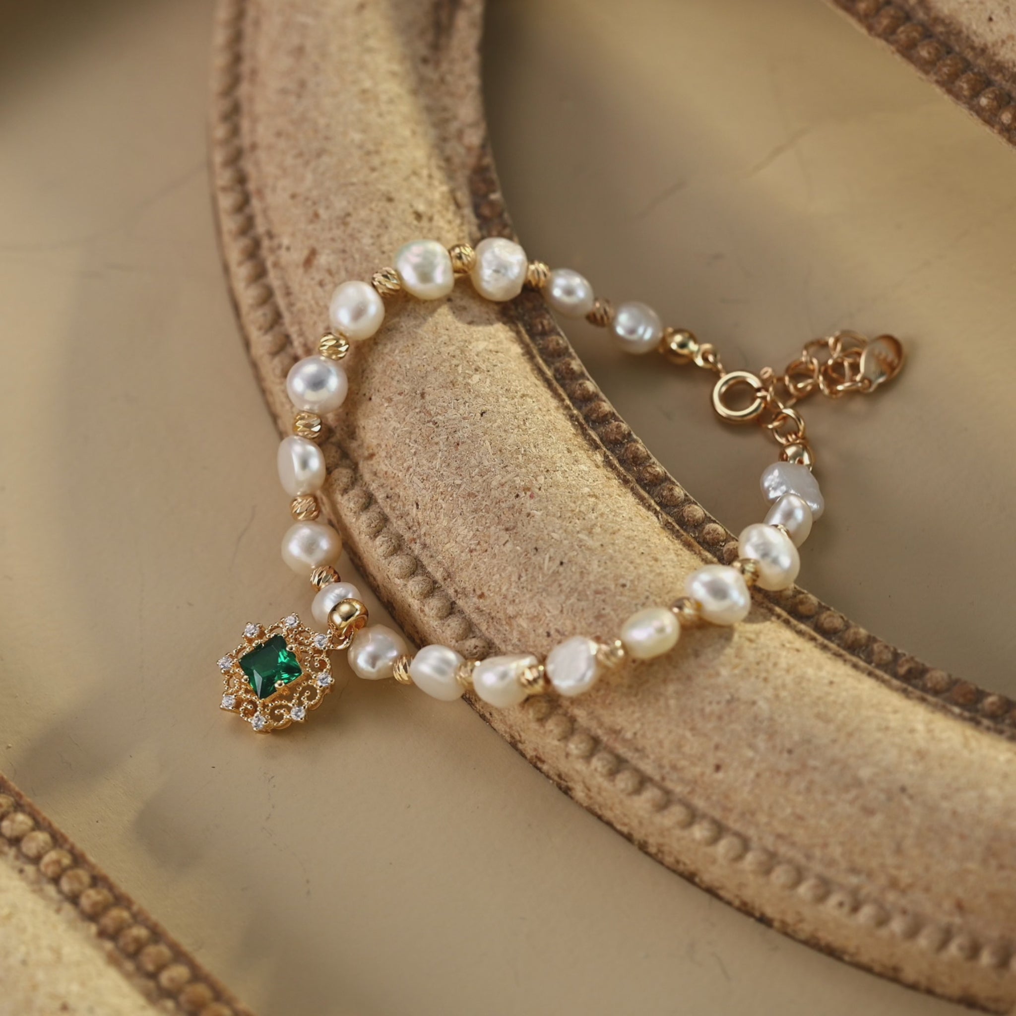 Elegant 925 silver natural pearl necklace featuring a noble French palace-inspired lace design. Set with a brilliant green zirconia stone, this piece exudes Nordic royal sophistication. The perfect fusion of natural pearls and ornate metalwork creates an exquisitely refined aesthetic with luxurious appeal.